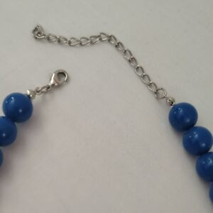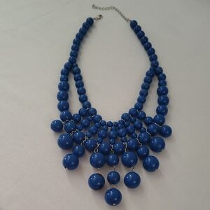 Bold blue beaded bib necklace with layered round beads for high-impact style. Lightweight design that elevates casual and dress looks. Features vibrant blue tones to make a striking statement. Has minor wear from storage. Necklace length adjustable approx 18"L.