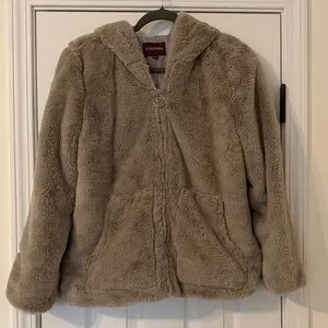 Stay warm with this cozy Vigoss Faux Fur zippered jacket. Features a hood and front pockets. Perfect for chilly days or evenings. Never worn; new without tags. Size small; length is approximately 24”, sleeve length is approximately 23”, and armpit to armpit is approximately 20”.
