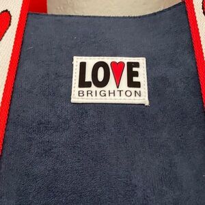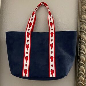 Brighton navy tote with bold red and white heart straps. Simple navy body with decorative straps. Casual and fun everyday style.