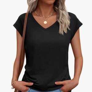 A breezy black V-neck tee designed for easy everyday wear. Soft, lightweight fabric provides comfortable all-day feel. Relaxed short sleeves and clean silhouette pair effortlessly with jeans or layers.