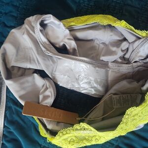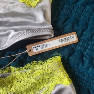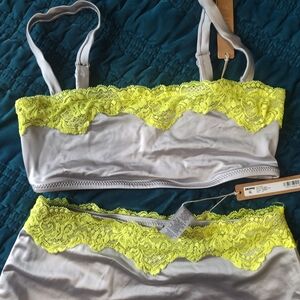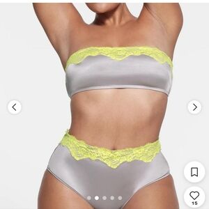 SKIMS Two-Piece Bikini Set in Light Gray with Neon Yellow Lace