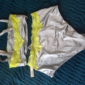 Soft light gray swim set with neon yellow lace trim. High-waist bottoms and bralette top. Stretchy, smooth fabric for comfort. Bright lace adds a pop of color.
