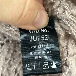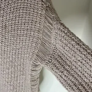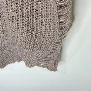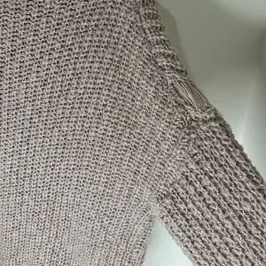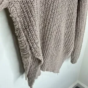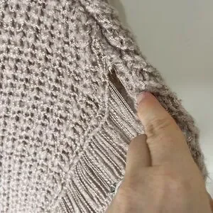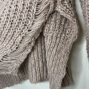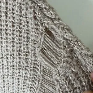 It looks like a few of the strings of the distressing may have come undone on the upper left arm (see photo) otherwise the sweater is in great preowned condition.