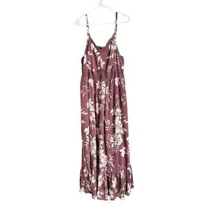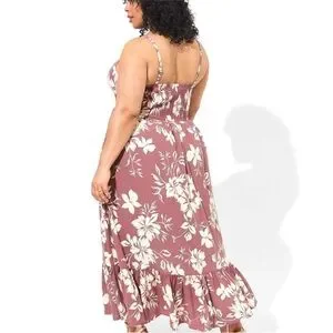 Torrid mauve pink maxi dress with white floral design and lace cut out under bust.