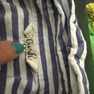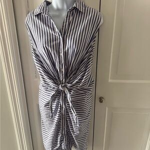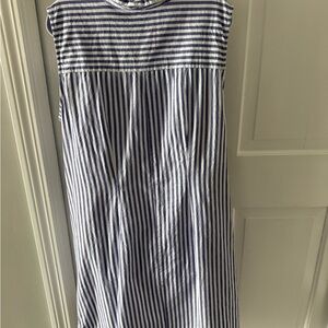 Sleeveless midi dress with vertical and horizontal stripes. Front button closure with a tied waist for shape. Lightweight, breathable fabric for easy wear. Timeless navy and white pattern works for many occasions. PTP 18-20. Length 36, Fits like a Large