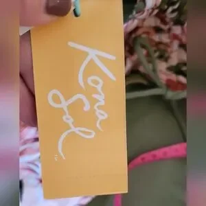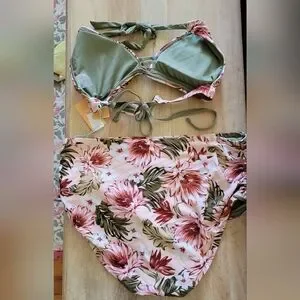 Two-piece halter bikini set by Kona Sol. Pink floral print on a cream background. Olive green ties and lining. Soft, feminine styling. Removable pads in top. High-waist bikini bottom with full coverage.