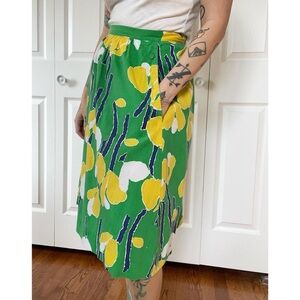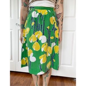 Vintage green A-line midi skirt with bold yellow and white floral pattern. Navy stem accents add contrast. Flowy silhouette that pairs with tees or blouses. Easy, feminine style for everyday wear. Pockets!