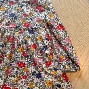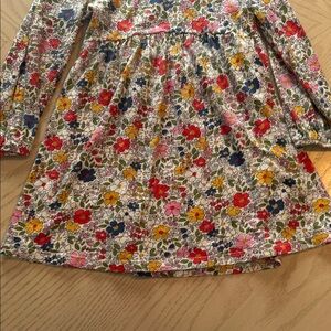 Soft cotton dress with an all-over floral print. Long sleeves and a gathered waist create a full skirt. Lightweight and easy to wear for everyday play.
