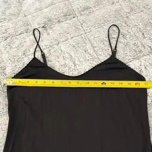 Sleek black maxi slip with delicate adjustable spaghetti straps. Lightweight, fluid fabric creates a graceful drape for a refined silhouette. In excellent used condition.