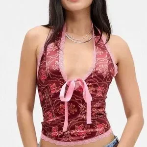 Sweet & slinky Kimchi Blue halter top in a slim & cropped fit. Designed with a plunging v-neckline, halter straps and a low open back. Topped with lace trim & a satin ribbon bow detail for a femme finish.