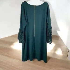 Nanette Lepore Evergreen Lace Sleeve Dress. This beautiful evergreen Nanette Lepore dress is perfect for any occasion, whether a wedding, church, or social event. The dress features a floral pattern, lace detail on sleeves, and long flutter sleeves, giving it an elegant look. It also has a zip closure for easy wear and comfortable stretch fabric made of nylon, spandex, and rayon. The dress is perfect for any season, whether summer, fall, winter, or spring, and is available in size 22W for plus-sized and fashion-forward women who want to make a statement.
