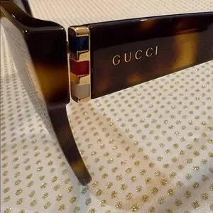 Gucci sunglasses with light green lenses. The frame is tortoise with Gucci logo on sides.