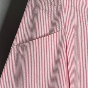 Light pink strapless seersucker dress with a ruched bodice and flared skirt. Soft, breathable fabric offers comfortable all-day wear. Side pockets add practical style. Feminine and effortless for warm-weather outings.