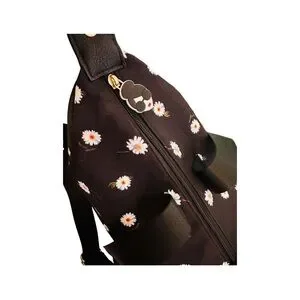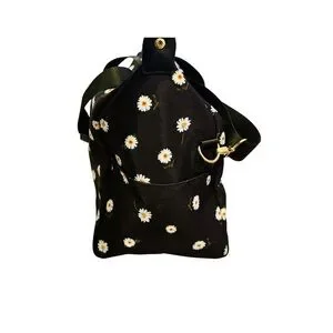 Spacious tote with scattered daisy print. Removable adjustable shoulder strap for versatility. Gold-tone hardware accents for a polished look. Lightweight fabric construction for easy carrying.