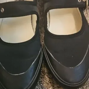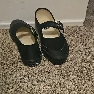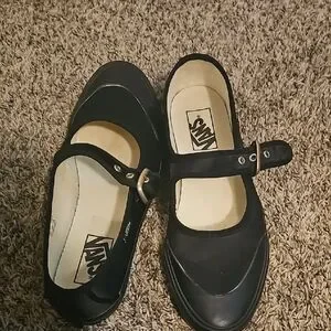 Classic Vans Mary Jane flats. Smooth black upper with buckle strap. Cushioned insole for comfort. Flexible rubber sole for traction. Versatile everyday style. These Vans run a half size too big . The insole is roughly 10 inches.