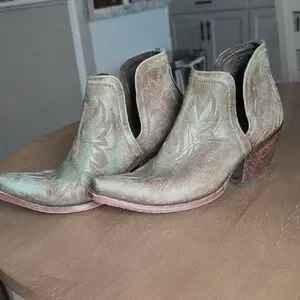 Women's Ariat Dixon Distressed Turquoise/Brown ankle booties. Gently worn size 9. please note scuffs on toe as shown in pictures.