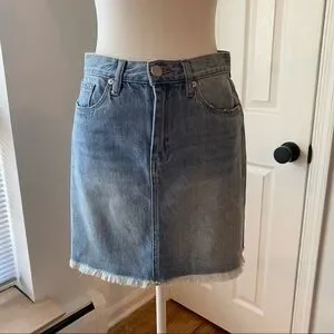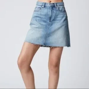 Blank NYC denim 5 pocket skirt. Belt loops with a single button closure & zip fly. seam down the middle front. Frayed hemline.