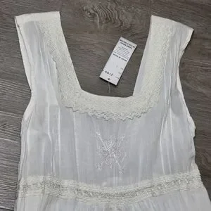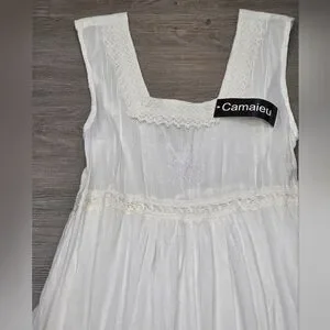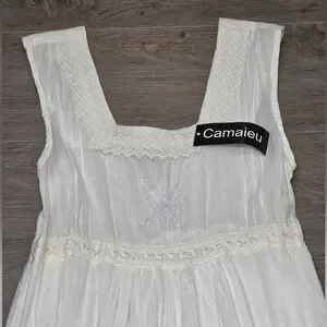 New with tag Camaieu dress womans size large. Elasticized back. Lined from the under the bust area. Beautiful embroidered on the chest & bottom in the front. Lace trim eyelet embroidery bohemian style. Cotton dress. Armpit to armpit is 16 flat 19 stretched. Shoulder to bottom is 44.