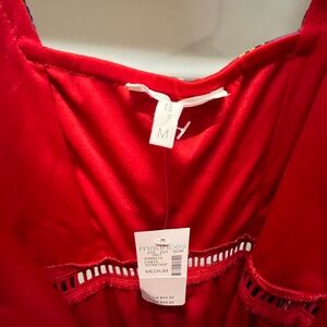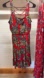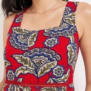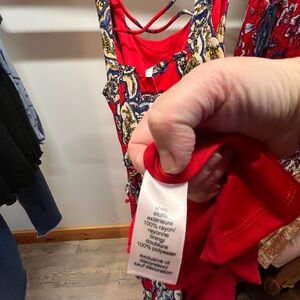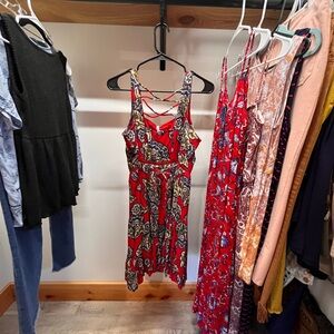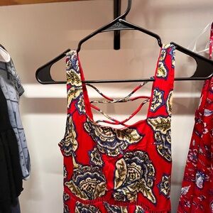 Sleeveless mini dress with bold floral print. Features crisscross straps at the back. Flowy skirt for easy movement. Vibrant, eye-catching pattern.