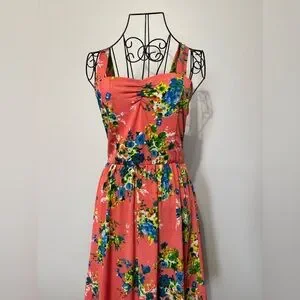 Sleeveless coral sundress with vibrant blue and green floral print. Sweetheart neckline with gentle ruching. Flowy skirt and wide straps. Lightweight and perfect for warm weather!