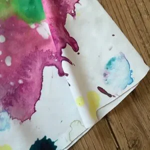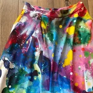 Bold watercolor splashes across a full circle skater shape. Bright paint-splatter pattern with an artistic, high-impact look. Versatile statement piece for casual or dressed-up outfits. Like new, has pockets! Meow pocket skater skirt. OG made in Australia.