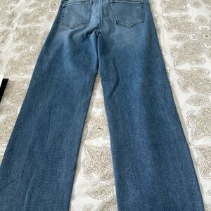 Timeless blue wide leg jeans with a flattering straight-to-flare silhouette. Soft denim offers comfortable all-day wear. Versatile mid-blue wash pairs easily with casual and dressier tops. Designed for a relaxed, on-trend wide leg look.