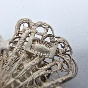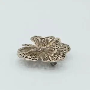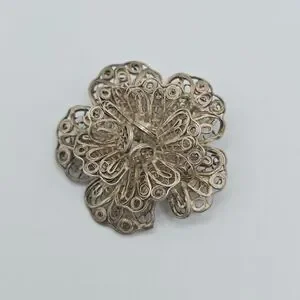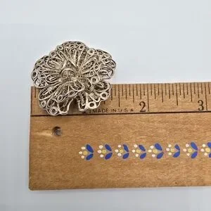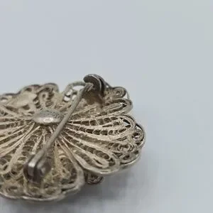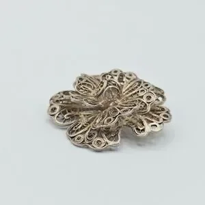 Brooch is in good, vintage condition with age-appropriate wear. The filigree flower structure is intact but the pin clasp no longer holds securely and will need repair to be worn as intended. Light surface wear and patina present. No cleaning or polishing has been attempted. Stamped, "SILVER MEXICO," which is clearly legible. Any condition notes are also pictured. Please review all notes prior to purchase.