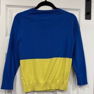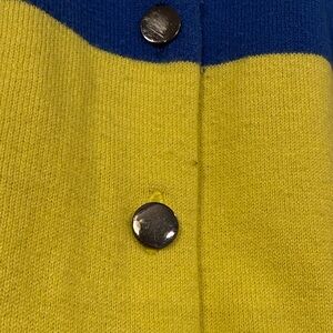 Chic cardigan with a vibrant blue top and yellow bottom. Features a button-up front. Ideal for a stylish wardrobe update. Worn from multiple washes. Metal buttons.