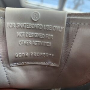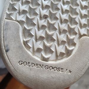 Close-up of a Golden Goose rubber outsole featuring raised star treads. Brand name embossed on the sole. Textured grip pattern across the surface.