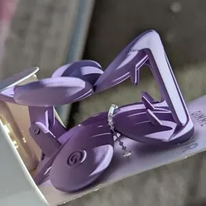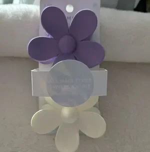 Set of flower-shaped hair clips in purple and cream. Perfect for all hair types.