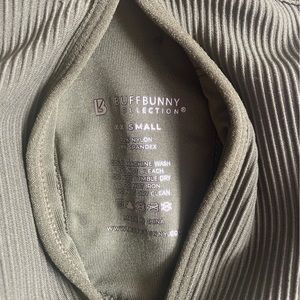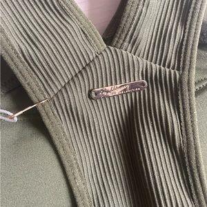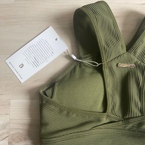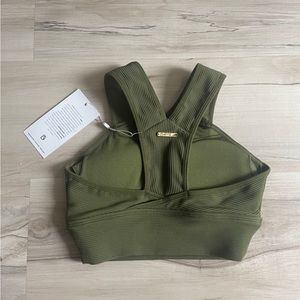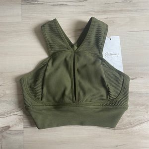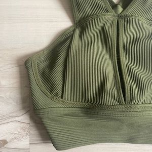 High neck, Light support bra has thick Y-shaped back straps and is made of a ribbed, soft fabric. Purchased from Secrets in the Sand Collection, Color is Grounded Dark Olive.