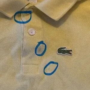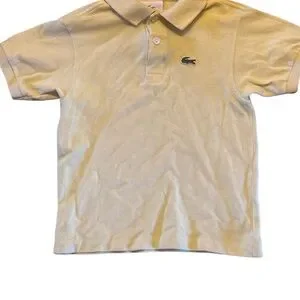 Lacoste Yellow Short Sleeve Polo Shirt Size 6: good condition except for a very minor hole on front of shirt & 2 marks on shirt. I have taken a picture of the shirt and a close up of the home and 2 marks which are all in the same area. Otherwise no other marks or holes on shirt. *Lacoste boys seems to run small. This fits much more like a 5 / 5T then 6