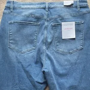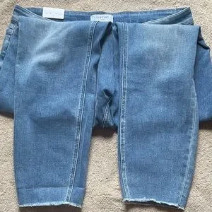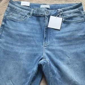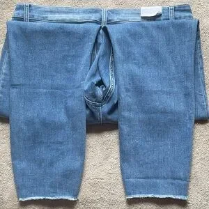 Brand new with tags! High rise with skinny bottoms. Stretch denim fabric. Waistband 19” laying flat. 28” inseam. 6” ankle opening. Frayed ankles.