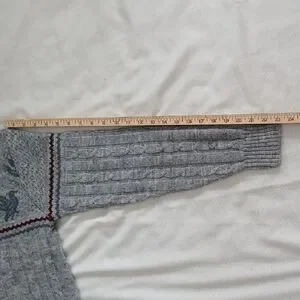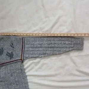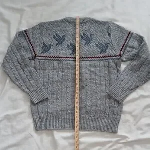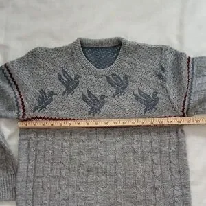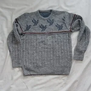 Cozy gray sweater with intricate duck design. Crewneck style. Ideal for casual wear.