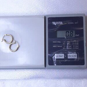 New baby or toddler hoop earrings. .8 grams of 14kt yellow gold hoop earrings with hinged hoop clasp. Earrings measure approximately 3/8 inch circumference. Earrings come nestled in foam in a small round plastic container.