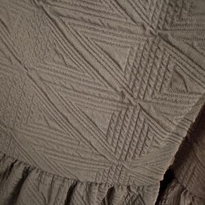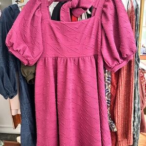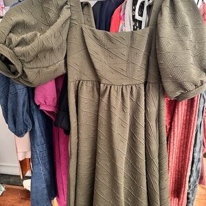 Free People dress in olive green. Textured geometric knit fabric. Puffy short sleeves and fun silhouette. Casual yet refined look. Ties behind back.