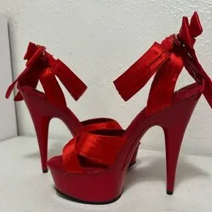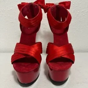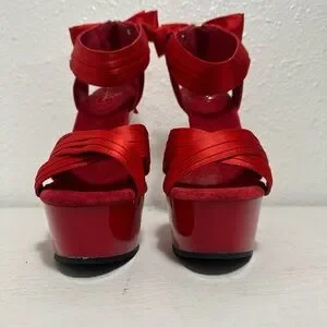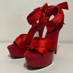 Pleaser delight stilettos Eye-catching red satin platform sandal with an ankle-tie wrap for a secure, adjustable fit. Sleek crossover straps and a high stiletto heel create a bold, elongating silhouette. Perfect for evening events and statement-making looks.