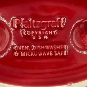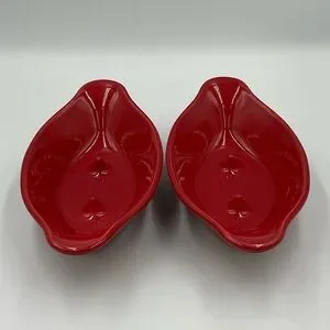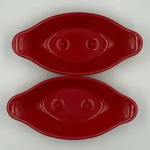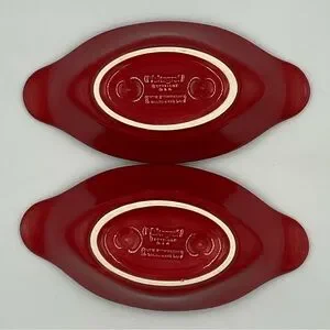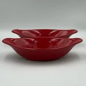 Two Pfaltzgraff baked potato/onion dishes in a glossy red glaze. Curved rim design for elegant presentation. Double handles. Durable ceramic with a smooth finish. Versatile for serving and display. Oven, microwave, and dishwasher safe. Measure approximately 8.5”x4.25”x2”. Nothing good condition. No chips or cracks. One has a small black spot (see last pic).