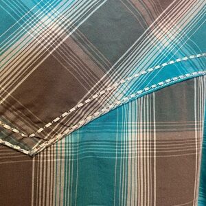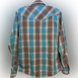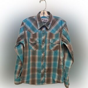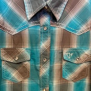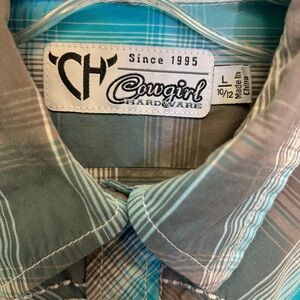 Classic western-style snap front shirt by Cowgirl hardware. Teal and grey plaid pattern with contrast stitching. Dual chest pockets and western yoke details. Casual ranch-ready look.