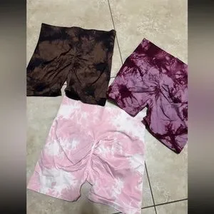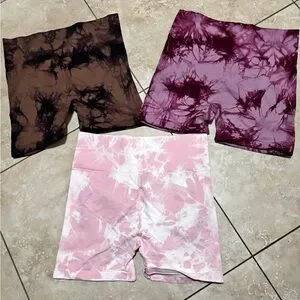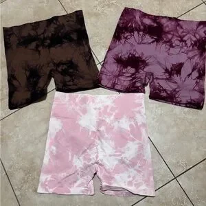 Set of three tie-dye scrunch shorts in brown, burgundy, and pink. Perfect for casual wear.
