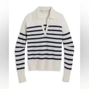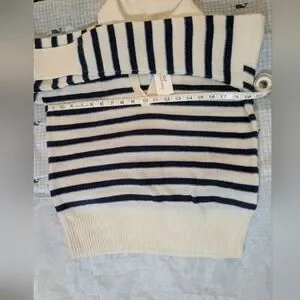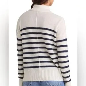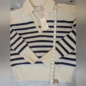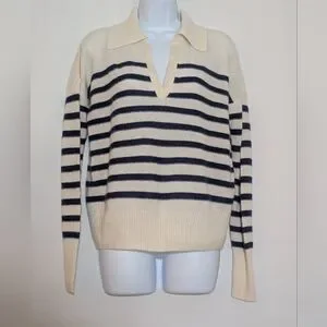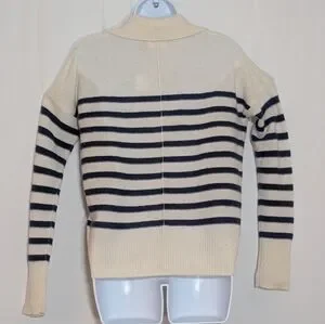 Elegant V-neck sweater with bold stripes. Soft cream and black design. Perfect for versatile styling.