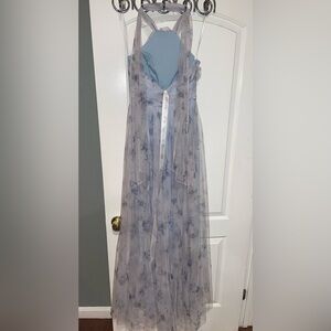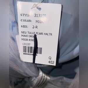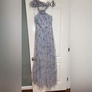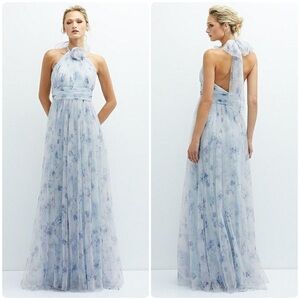 New! Dessy Collection Floral Tie-Back Halter Tulle Dress & Rosette Mist Garden🩵