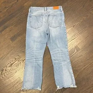 Stylish light blue cropped jeans. Frayed hem adds a trendy touch. Ideal for casual outings.
