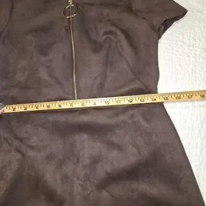 This elegant brown dress is perfect for any occasion. Its sleek design and rich color make it a versatile addition to your wardrobe. Faux Suede Velvety Texture. Body Con and GORGEOUS Zip Back and Zip Front With Gold Tone O Ring and Hardware. Go from day to night easily.