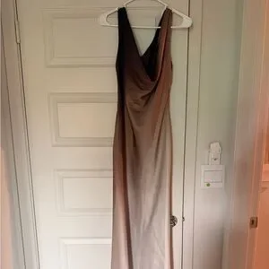 Sleek satin slip maxi with a subtle taupe ombré. Scoop neckline and sleeveless design. Smooth, flowing fabric creates a flattering column silhouette. Minimal, elegant look for day or evening wear.