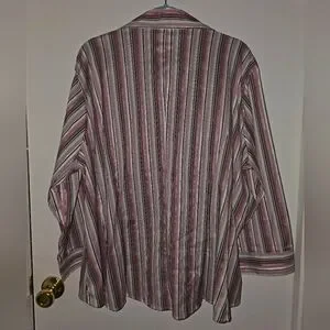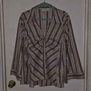 Lightweight Cato button-down blouse with striped pattern. Collared neckline and full front buttons. Slight flare at hem and three-quarter sleeves. Versatile soft pink, white and brown tones for many outfits.