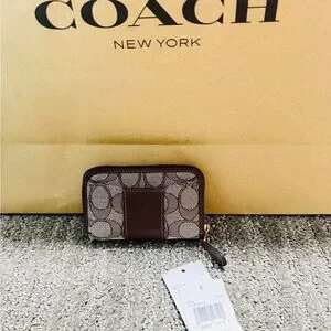 Elegant Coach wallet with signature pattern. Features brown leather accents and gold-tone zipper. Coach Retail.