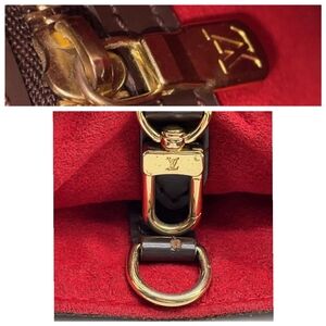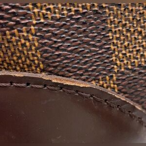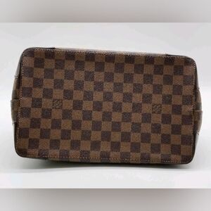 Classic Louis Vuitton Damier tote in rich brown tones. Crafted in checkered coated canvas with dark brown leather trim and gold hardware. Sophisticated and versatile for everyday wear. Features a structured silhouette and comfortable top handles. This bag is not new. Has been gently used. See pictures for light rubbing on corners. The plate on front has signs of use as expected with these bags. There are no cracks in the body of this beautiful bag! Features beautiful gold hardware, side snap buttons to draw in size, brown checkered print! I do not smell anything on this bag! This varies with each person.
