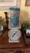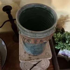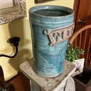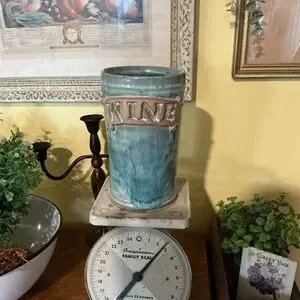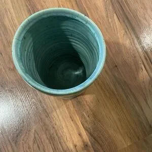 Beautiful colors. Aqua blue body with subtle teal and seafoam variations. Raised tan lettering detail. Glossy finish. Great for standalone display or flowers if you do not want to use it to chill your wine. Approximately 7 1/2 inches tall and 4 1/2 inch diameter has a swirl texture on the inside. This is handmade so it has natural flaws in it, but I do not find any cracks or chips. It needs a good cleaning it has been in the basement. Solid piece be careful bundling.