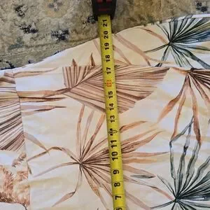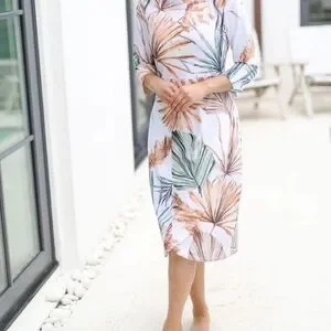 Lightweight midi dress by Dainty Jewells. White base with leafy palm print. Features green and tan botanical accents. Simple, elegant silhouette. Easy to wear for daytime events. Lined with mesh and snap button closure at the bottom.